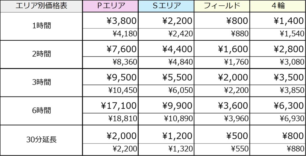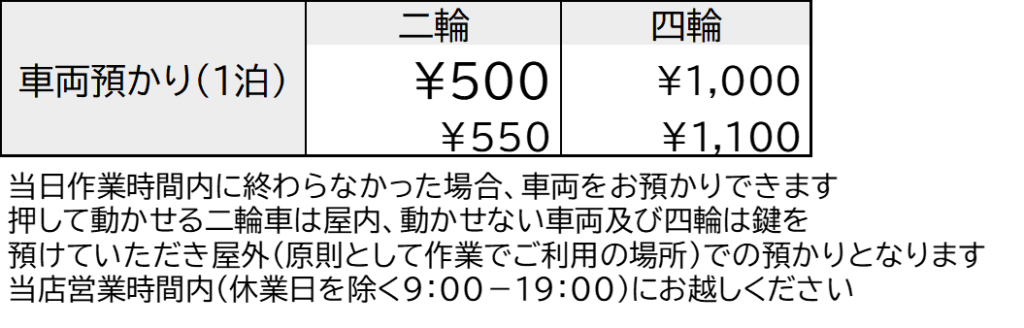 ※各エリア共通、無料でご利用頂ける基本工具類のほか、室内(S/Pエリア)ご利用の方には